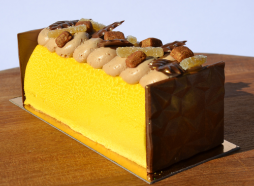 Sur un biscuit pain de Gênes agrumes, une gelée aux agrumes avec un crémeux noisettes et une mousse orange, citron, Kalamansi, mandarine. enrobage velours jaune citron