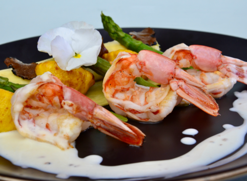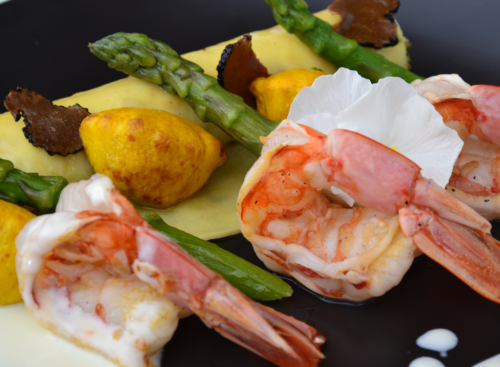 Raviole ouverte de poireaux à la truffe, sauce vin blanc truffé et gambas