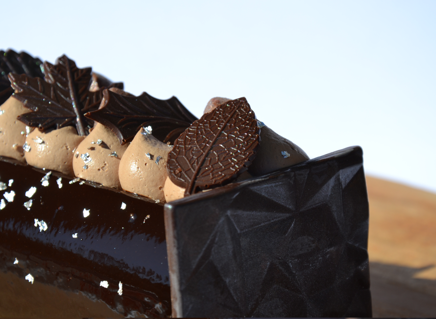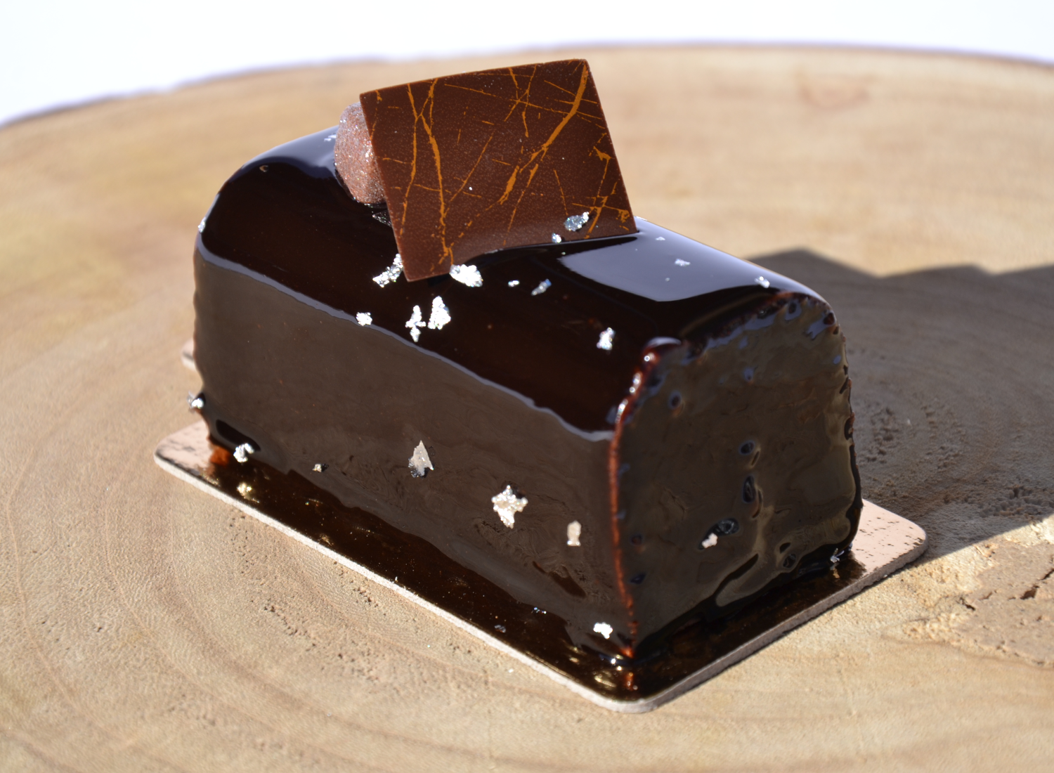 Sur une dacquoise noisette, un croustillant praliné amande noisette, mousse chocolat 64%, glaçage chocolat et crumble cacao doré