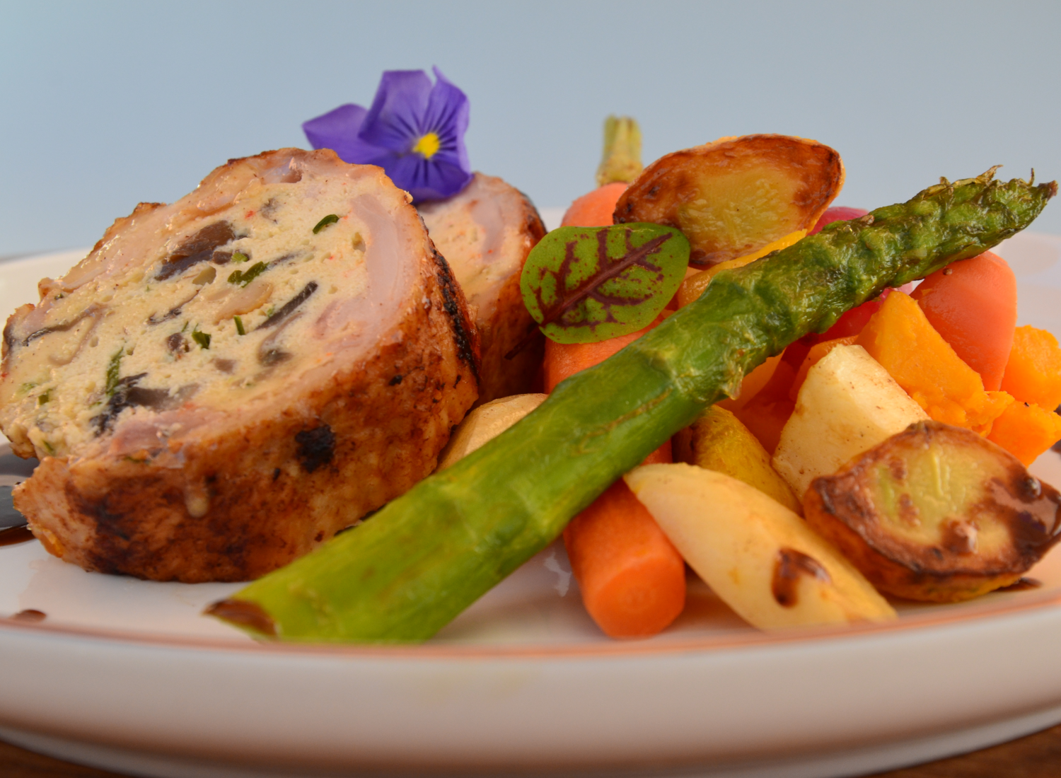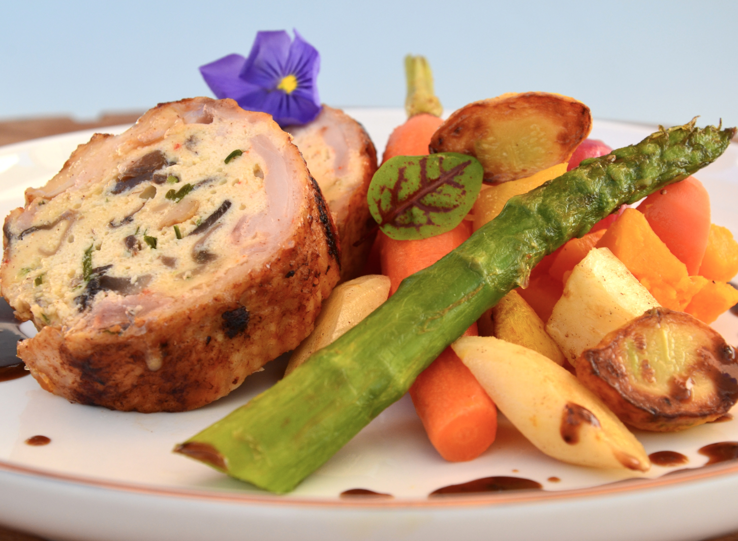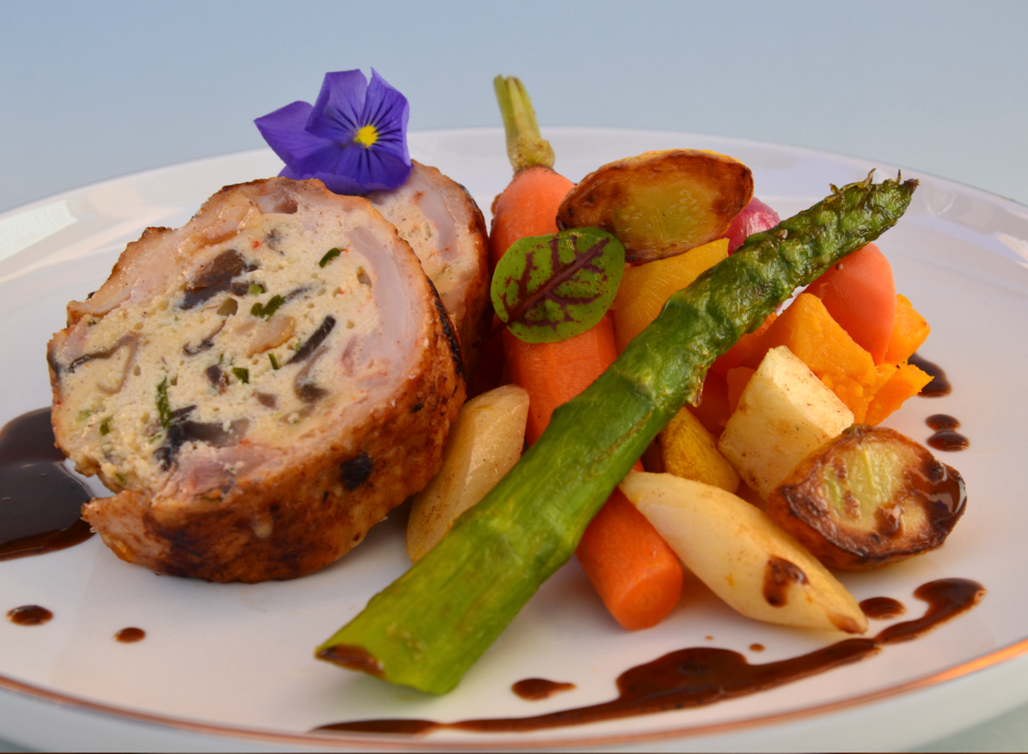 Notre poularde est accompagnée d’une poêlée de légumes d’antan et d’un mélange de champignons des sous-bois
